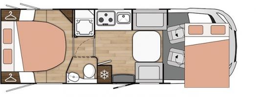 La autocaravana integral contine un gran salón con sofás cara a cara y mesa plegable