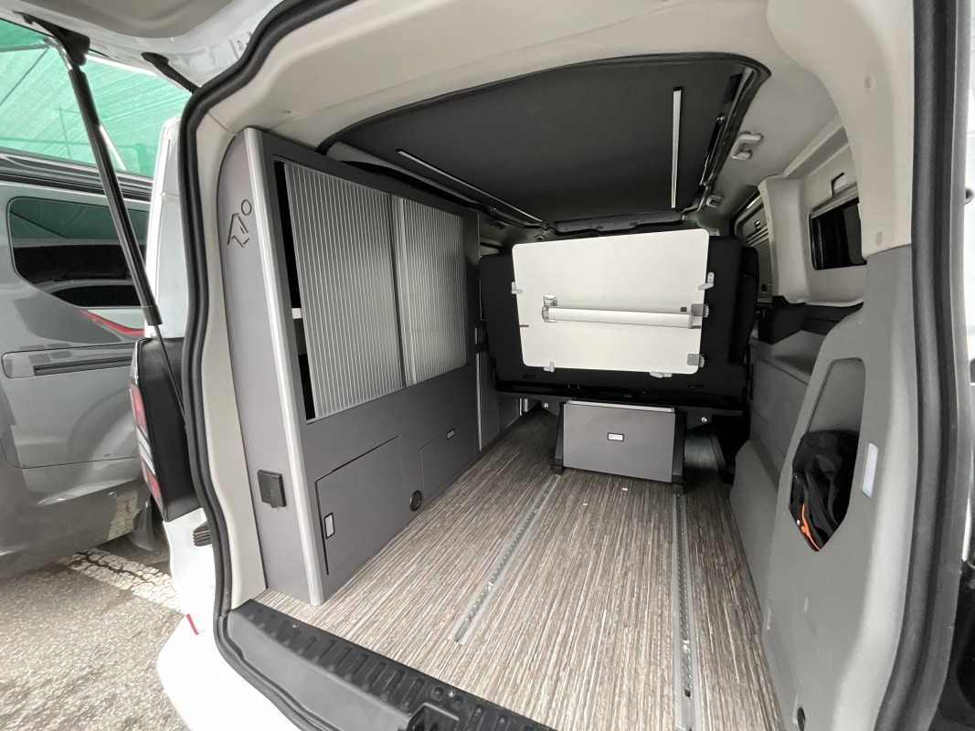 Cama trasera abatible o modular, que ofrece espacio de carga y descanso.