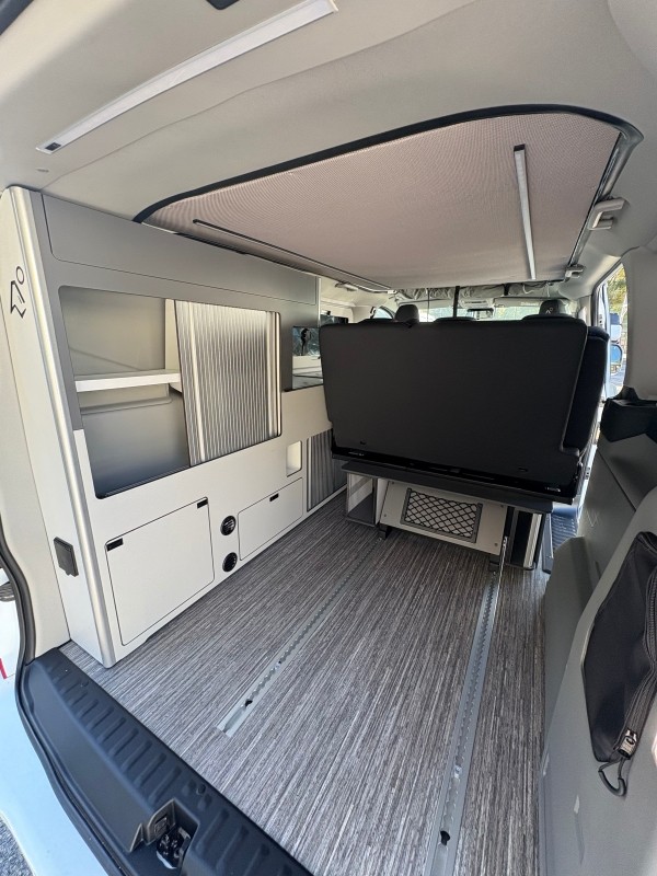 Cama trasera abatible o modular, que ofrece espacio de carga y descanso.