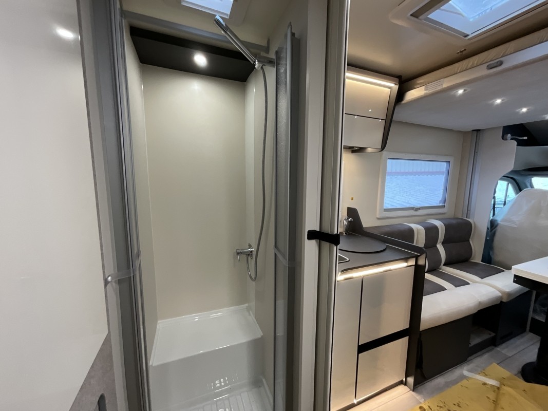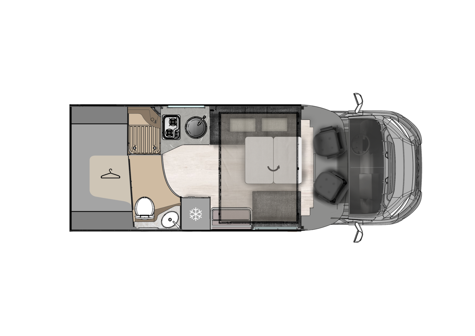 Versatilidad para 4 personas, con cama de pavillón + dinette convertible, baño trasero y gran armario.