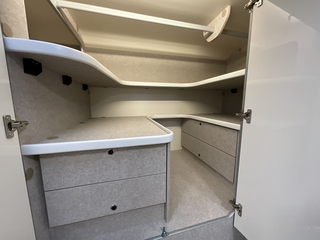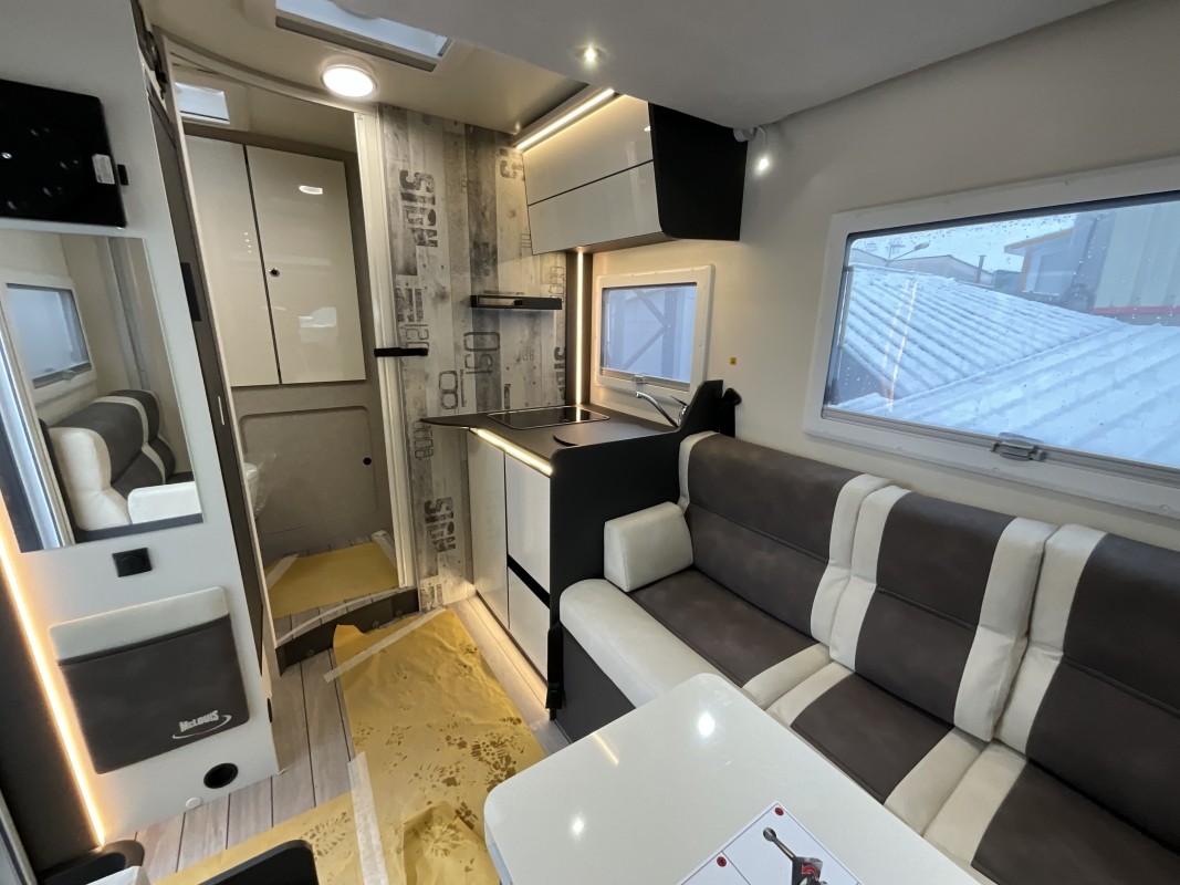 - Panel de control CP Plus, soporte TV, cubre-fregadero, fundas de asientos de cabina, oscurecedores plisados en la cabina.