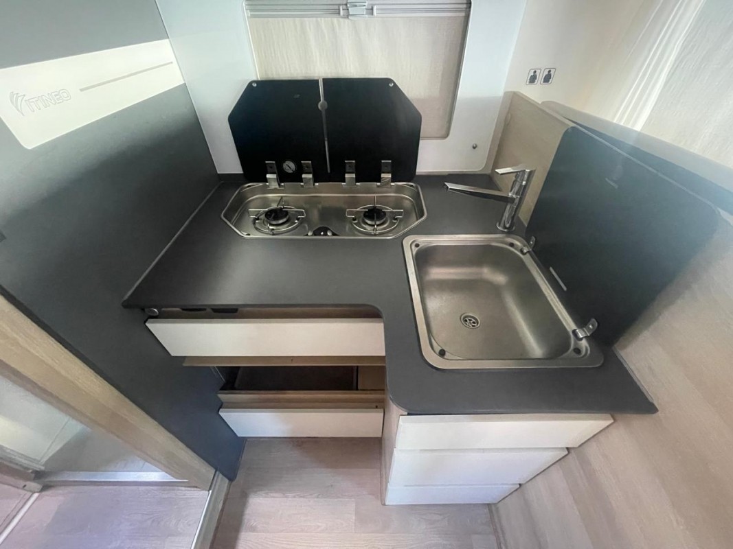 Cocina con fogones: Una cocina equipada con fogones de gas, frigorífico de gran capacidad y espacio adicional para preparar tus platos favoritos mientras viajas.